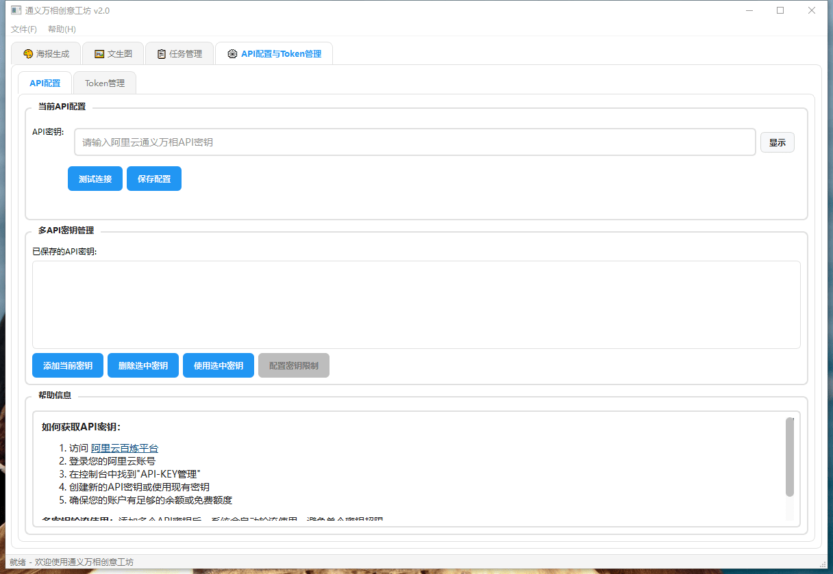 一个基于PyQt6和阿里云通义万相API的桌面创意生成应用程序,支持海报生成、文本转图片等多种AI创作功能,支持多API密钥管理和独立Token限制。